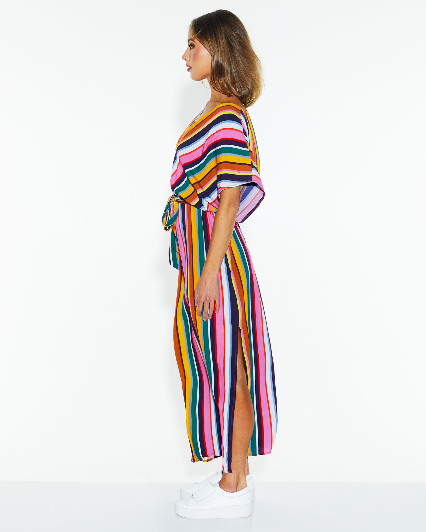 The Dream Factory Dress combines elegance with comfort. Its faux wrap design and detachable tie, along with side splits and drapey fabric, create a relaxed, refined look perfect for spring.