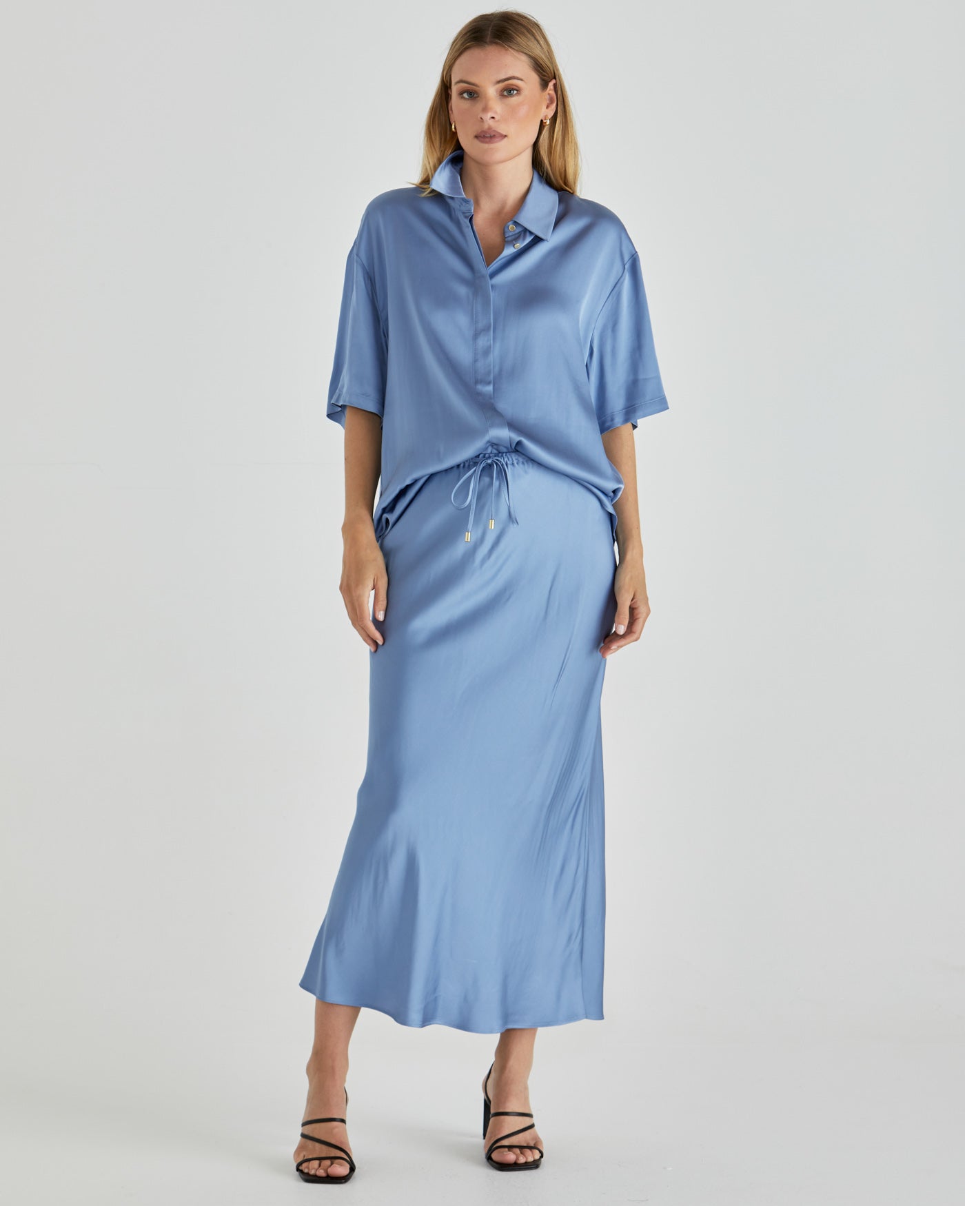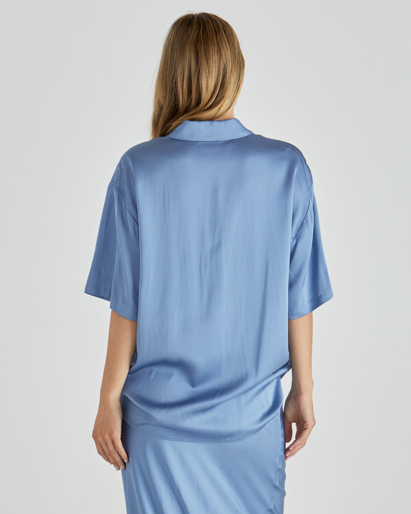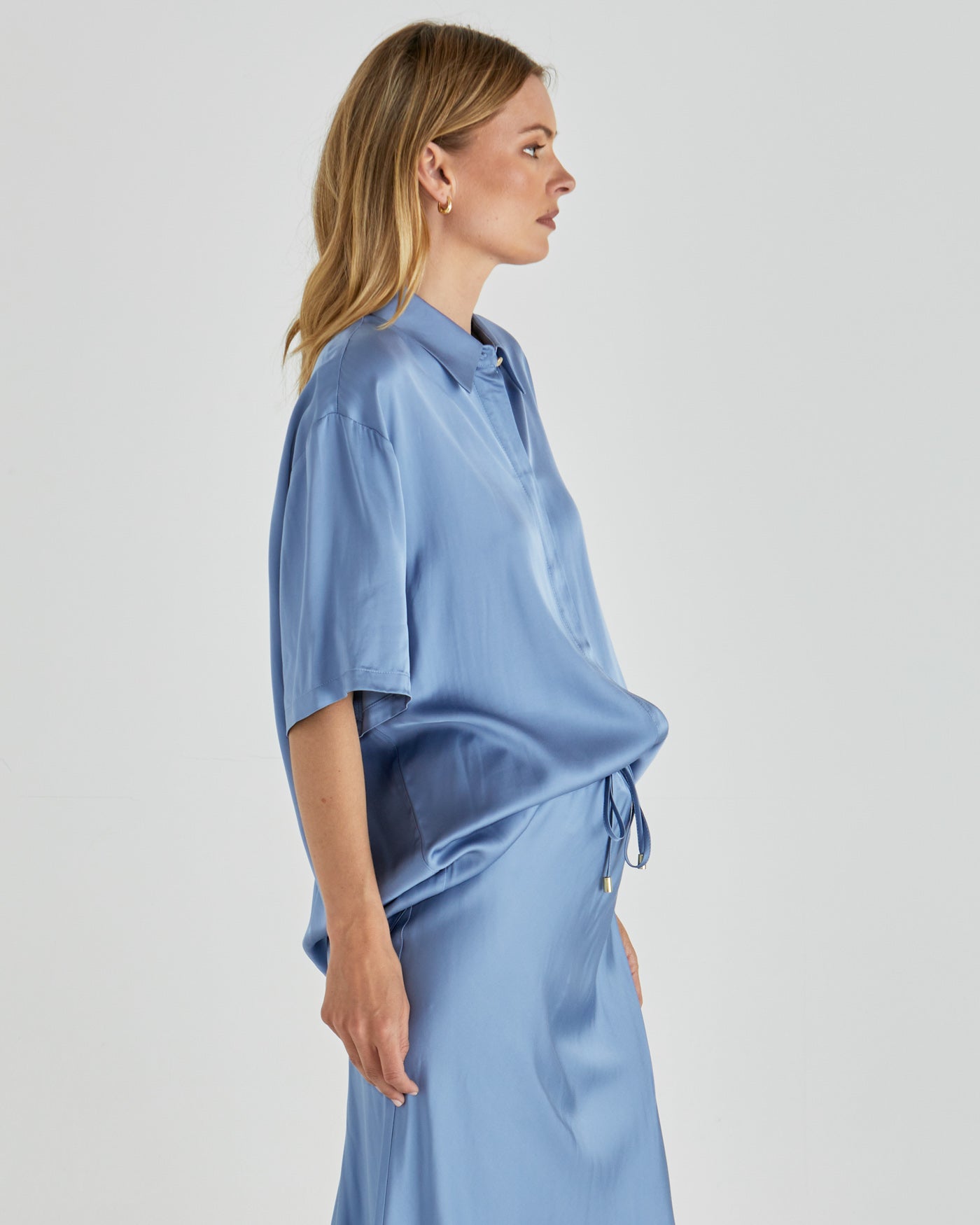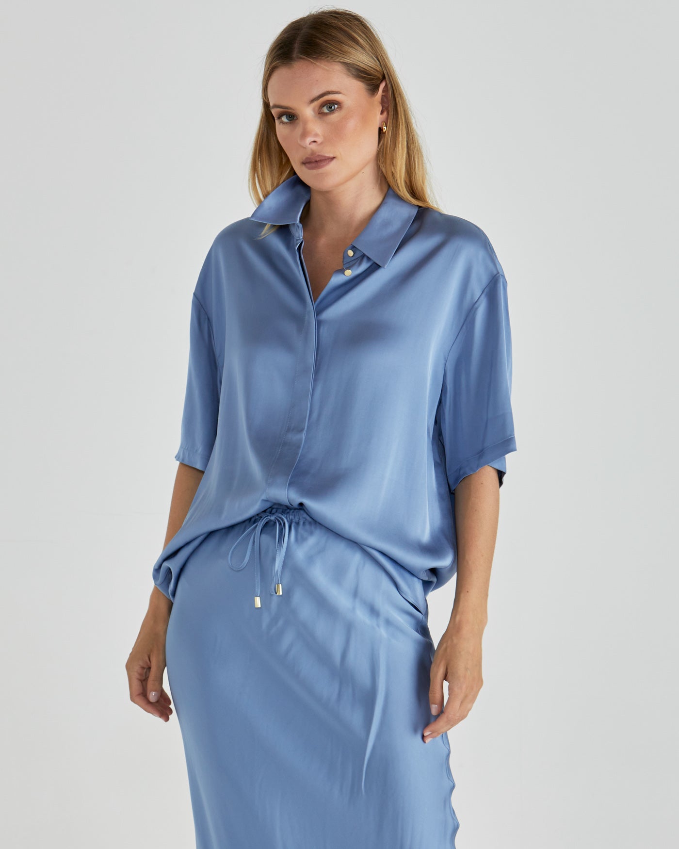 Sophisticated yet understated, the Dynamics Shirt brings a touch of refinement with gold button details and a concealed placket. Its unlined, relaxed fit and drapey fabric make it an elegant piece for modern, elevated style.