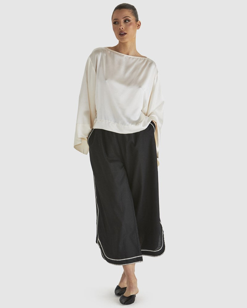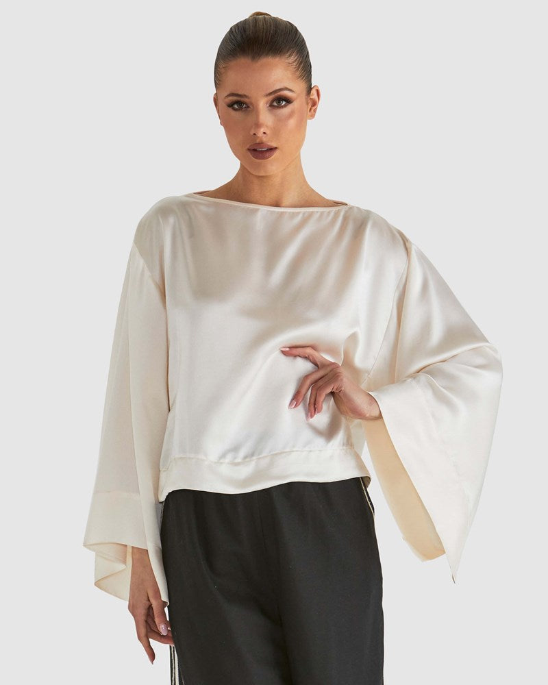 Statement-making yet effortlessly wearable, the Glow Top features wide kimono sleeves and a drapey satin fabric. A wide hem detail enhances its fluid silhouette, while the oversized fit creates a relaxed yet elevated look. Perfect for layering or wearing on its own, this piece exudes understated glamour. A sophisticated staple for modern wardrobes.