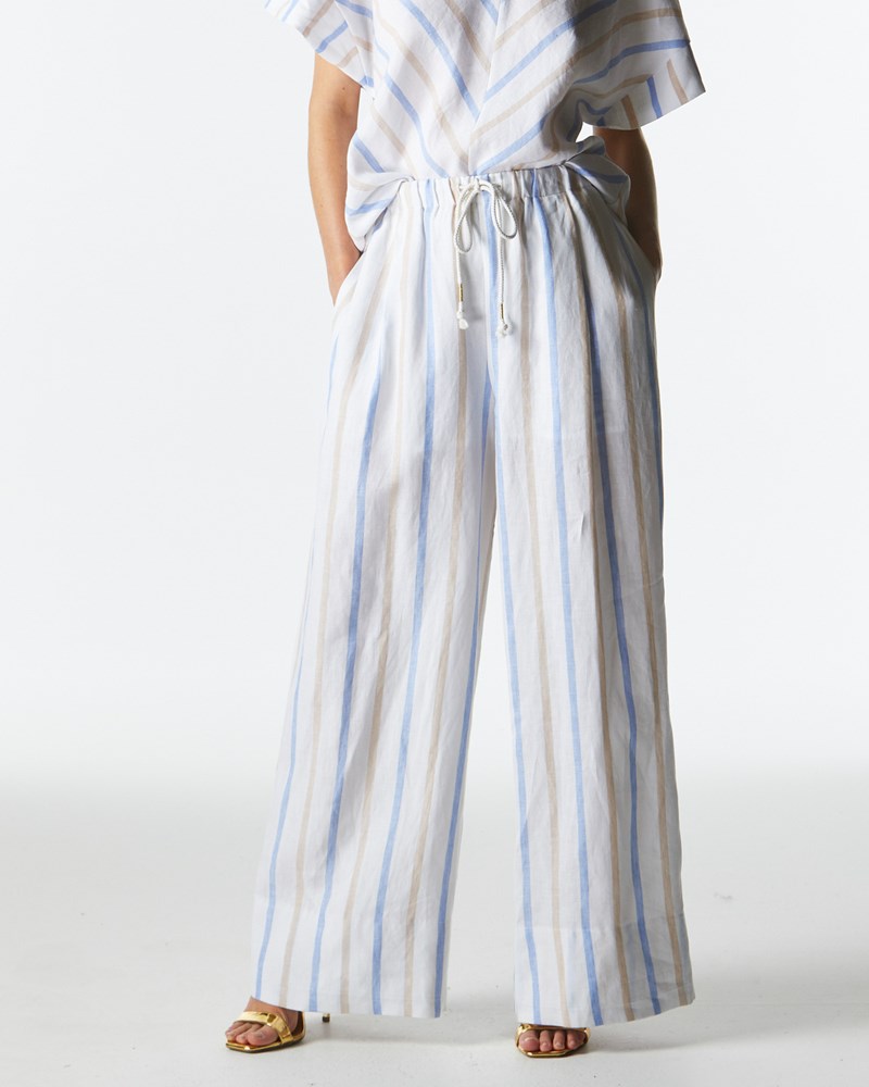 Sophisticated yet relaxed, the Poolside Wide Leg Pants feature a wide-leg silhouette and a wide band on the hem. With an elasticated drawcord waistband, these pants are designed for comfort and elevated style.