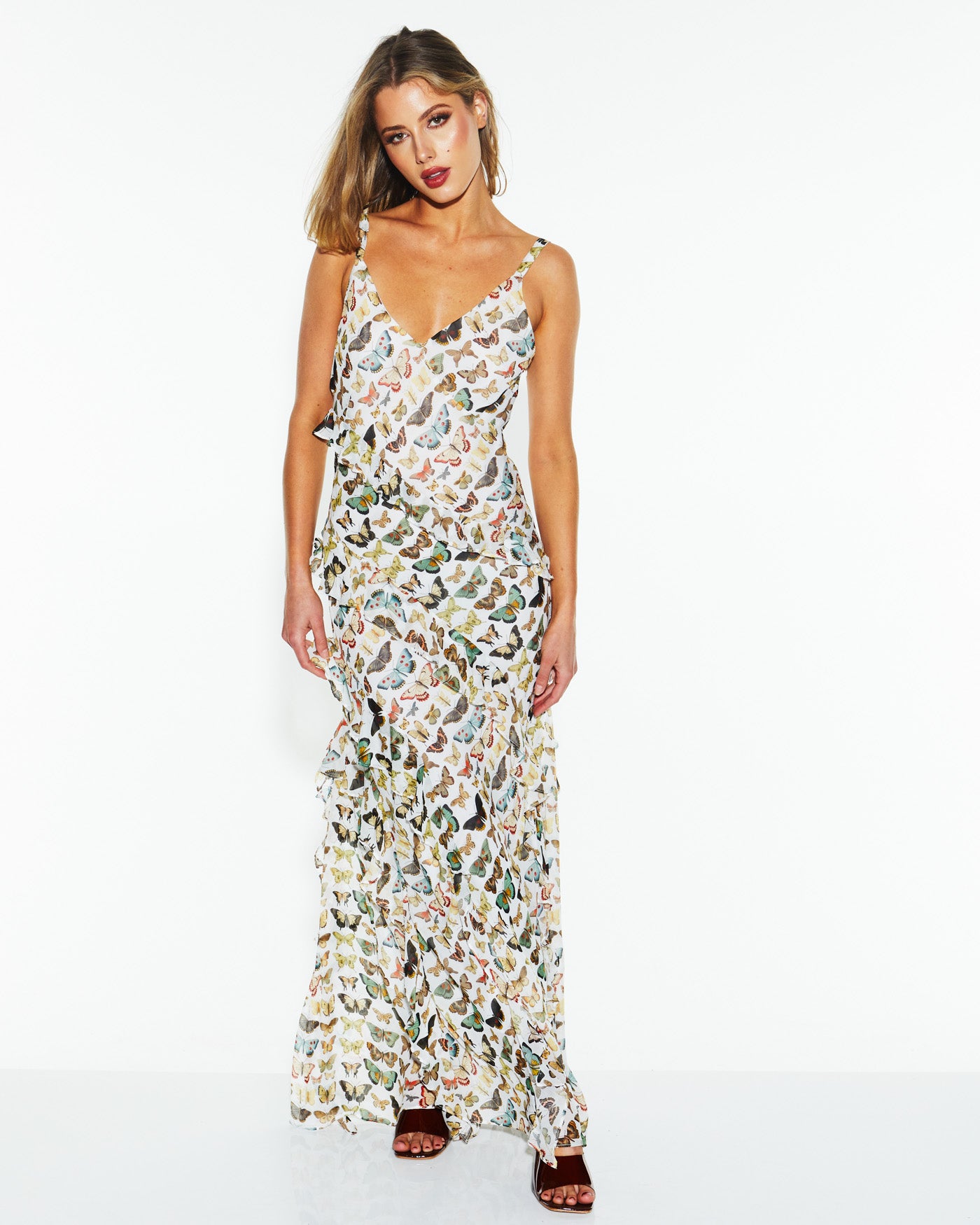 Elevate your spring wardrobe with the Taking Flight Ruffle Dress. Its maxi length and ruffle detail, combined with adjustable straps and a soft drapey fabric