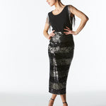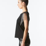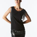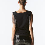 The Windflowers Top brings sophistication with its stretch fabrication and beaded tassels at the armhole. A scoop neckline and fitted body make this a comfortable yet polished option.