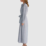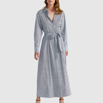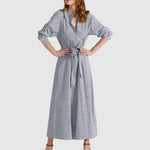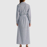 The Madras Dress features bold metal button details and a self-fabric tie for a sophisticated, polished look. The cuff with button detail and gold button accents add elevated touches, making this dress a refined choice for winter styling.