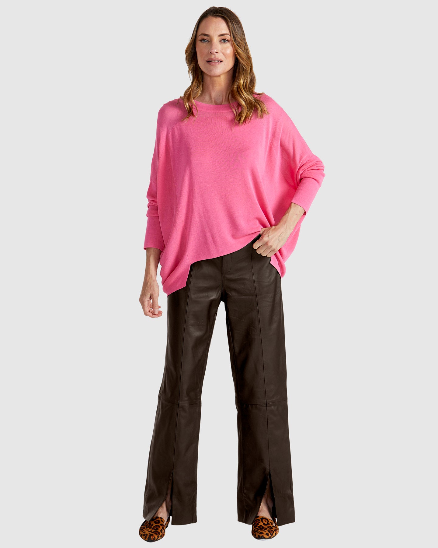 The Clarity Knit offers a sophisticated yet relaxed look with a boat neckline and a hi-low hem with side splits. The soft knit and dropped shoulder detail make this piece both chic and refined, perfect for adding warmth and elegance to your winter wardrobe.