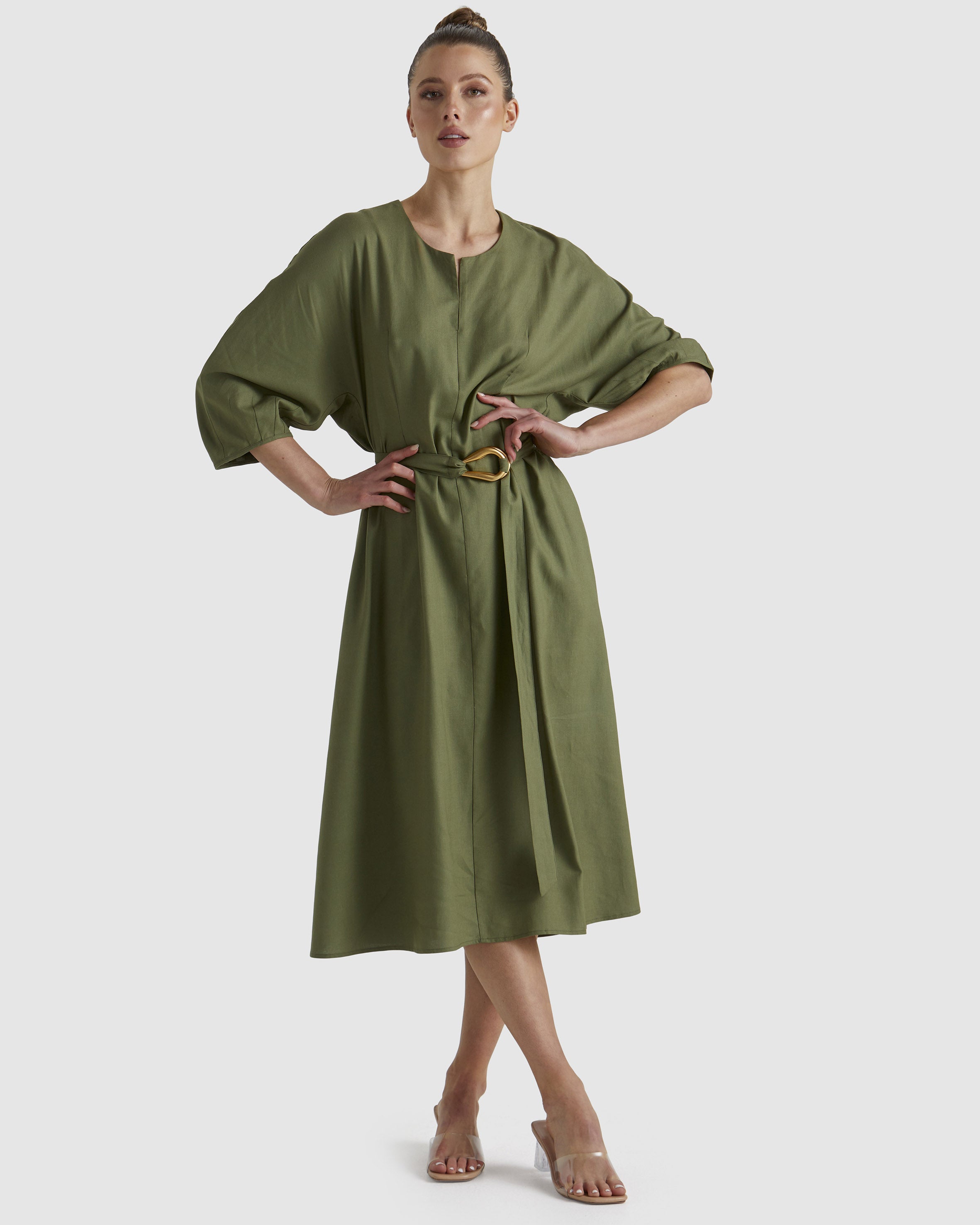 The Shoreline Dress combines classic elegance with modern appeal, featuring batwing 3/4 sleeves and a flattering silhouette. A self-fabric belt with gold buckle detailing enhances its effortlessly polished look.