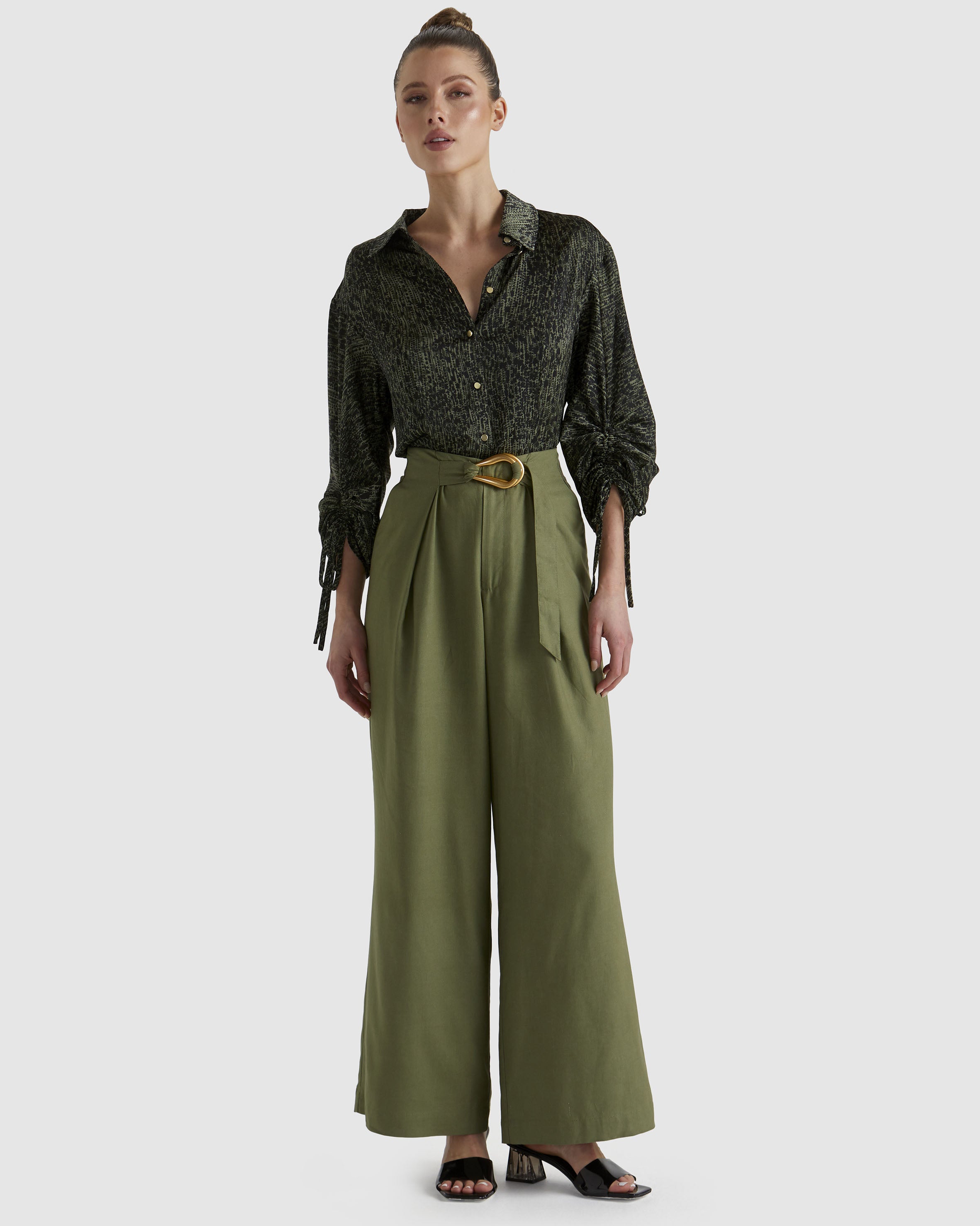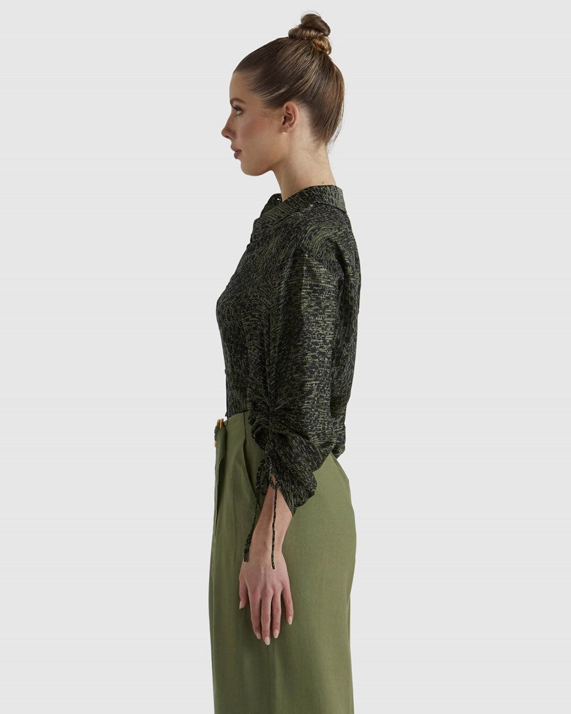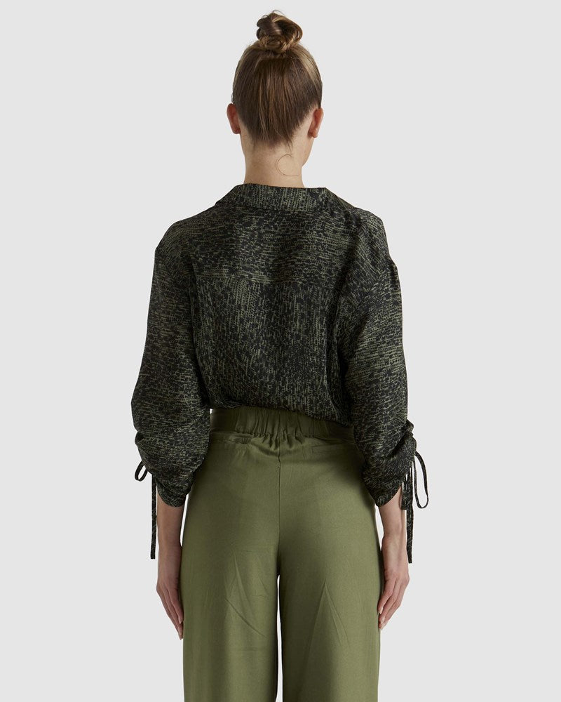 The Explorer Shirt offers a polished yet casual vibe with smooth fabrication and a relaxed fit. Its ruched sleeves with ties and gold button details add an elevated touch, making it effortlessly current and refined.