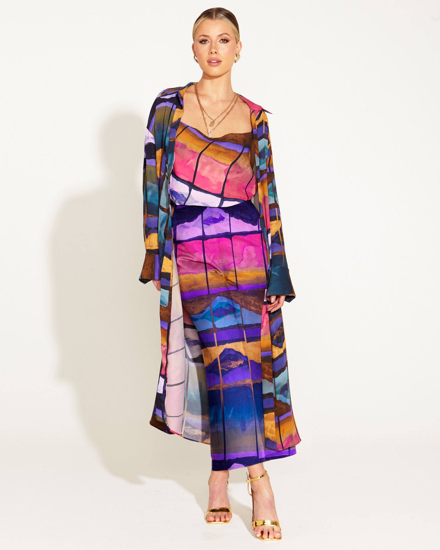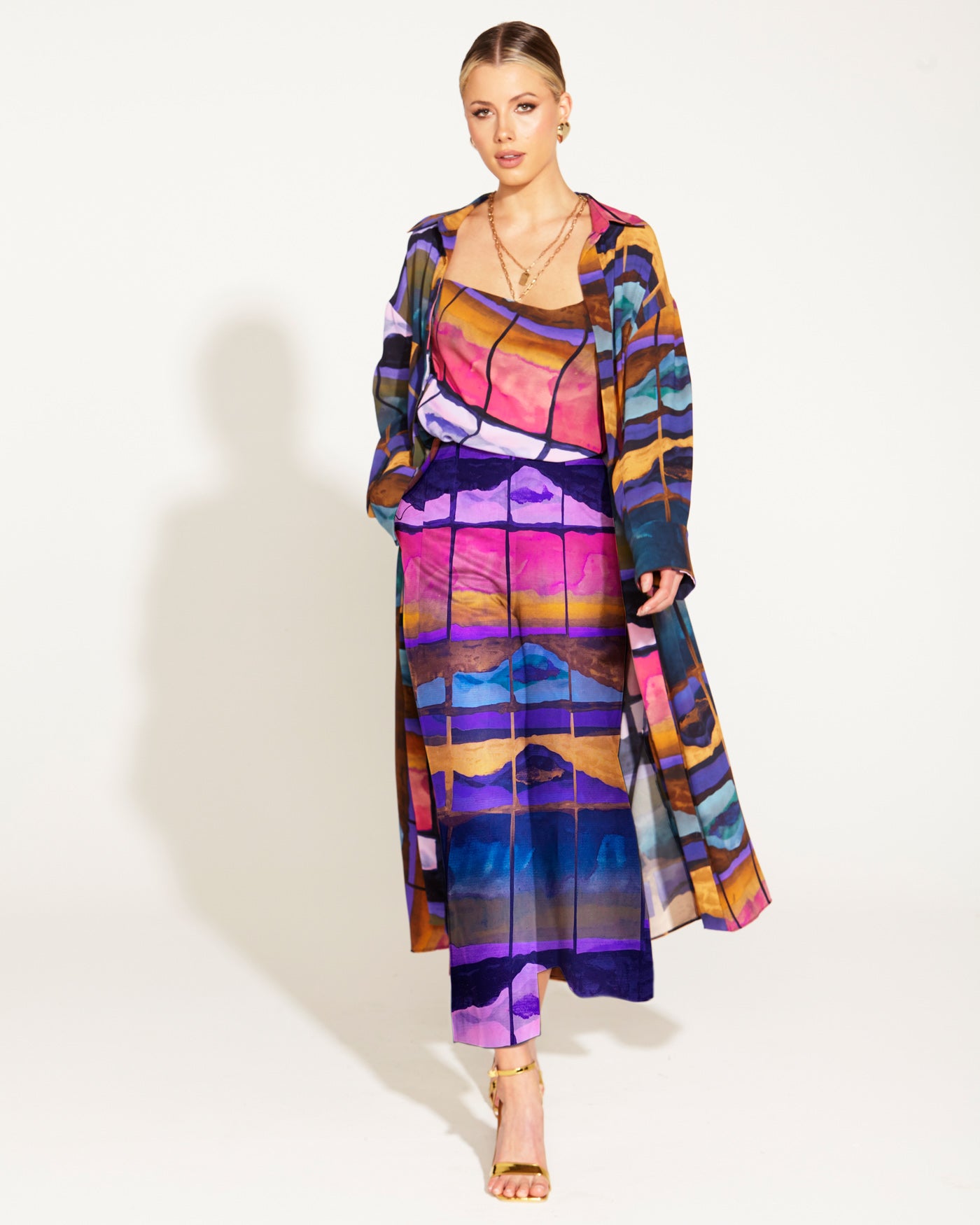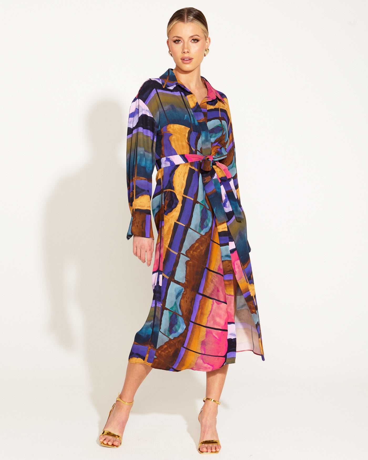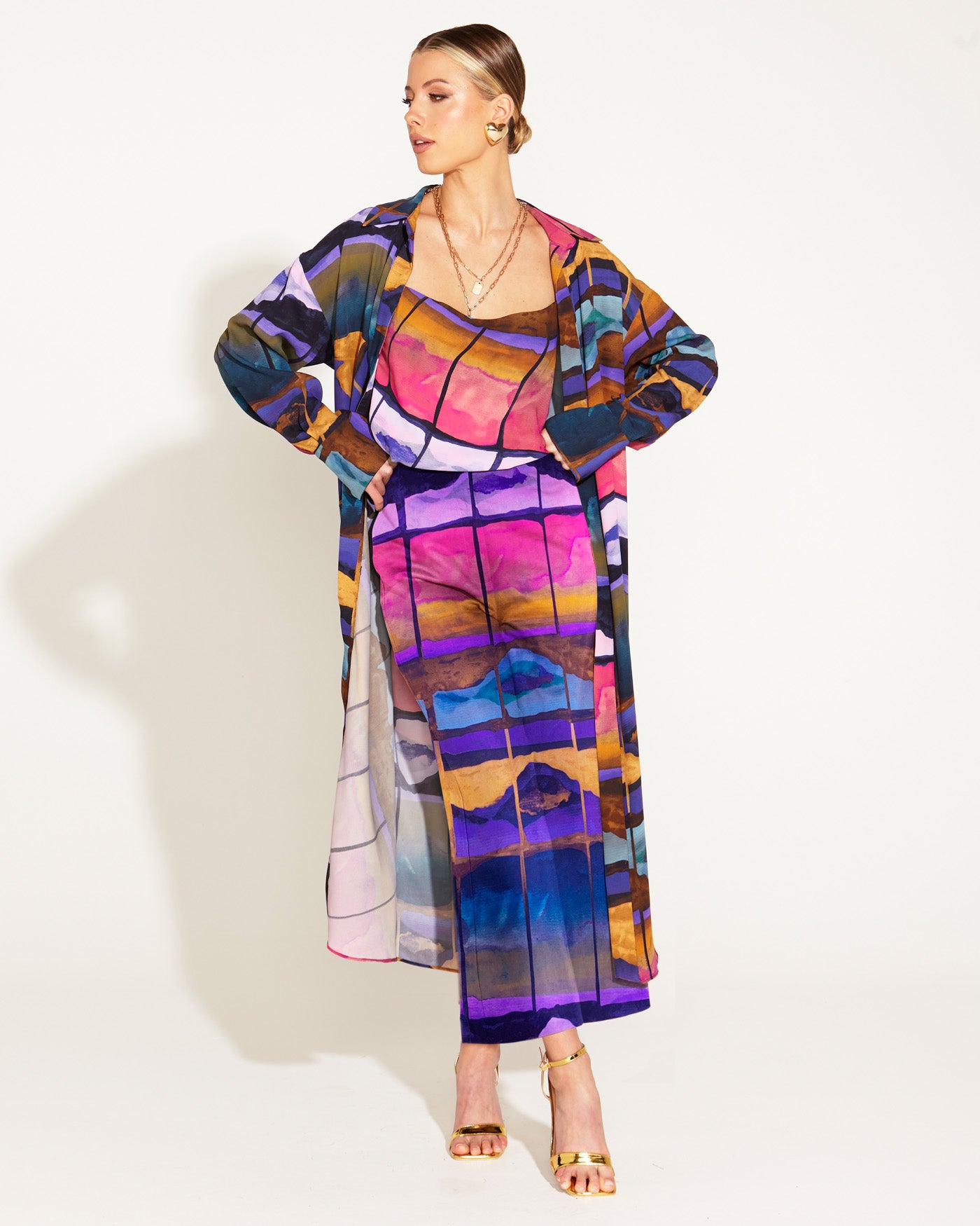 Somewhere Near Home Long Sleeve Wrap Duster Midi Dress - Rainbow Marble Stripe