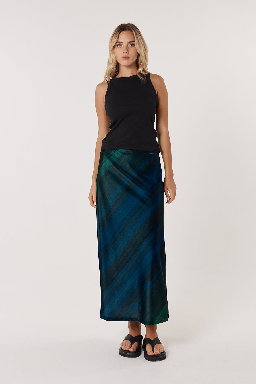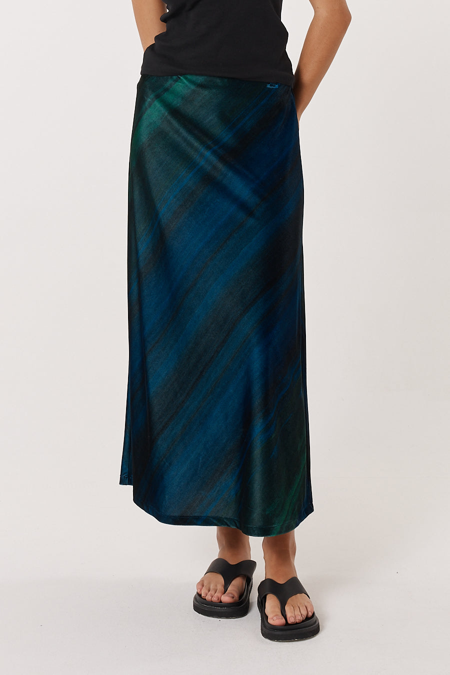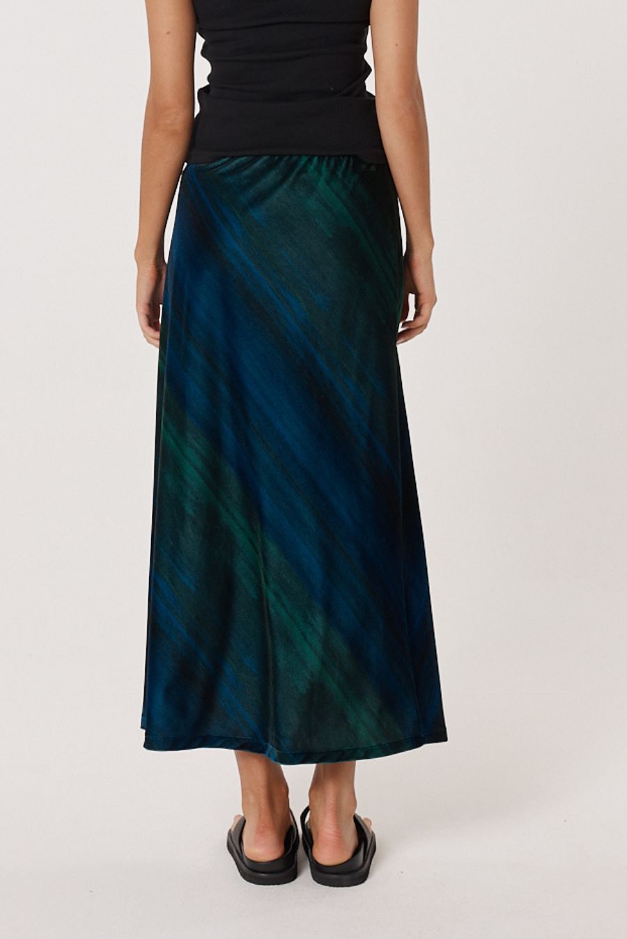 The Sublime Skirt combines an ombre printed velvet fabric with a bias cut and elastic waistband for a sophisticated, polished look. Unlined for a lightweight feel, this midi skirt offers comfort and elegance, perfect for creating refined winter ensembles.