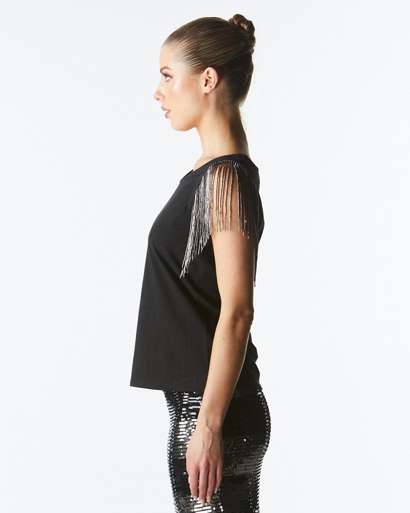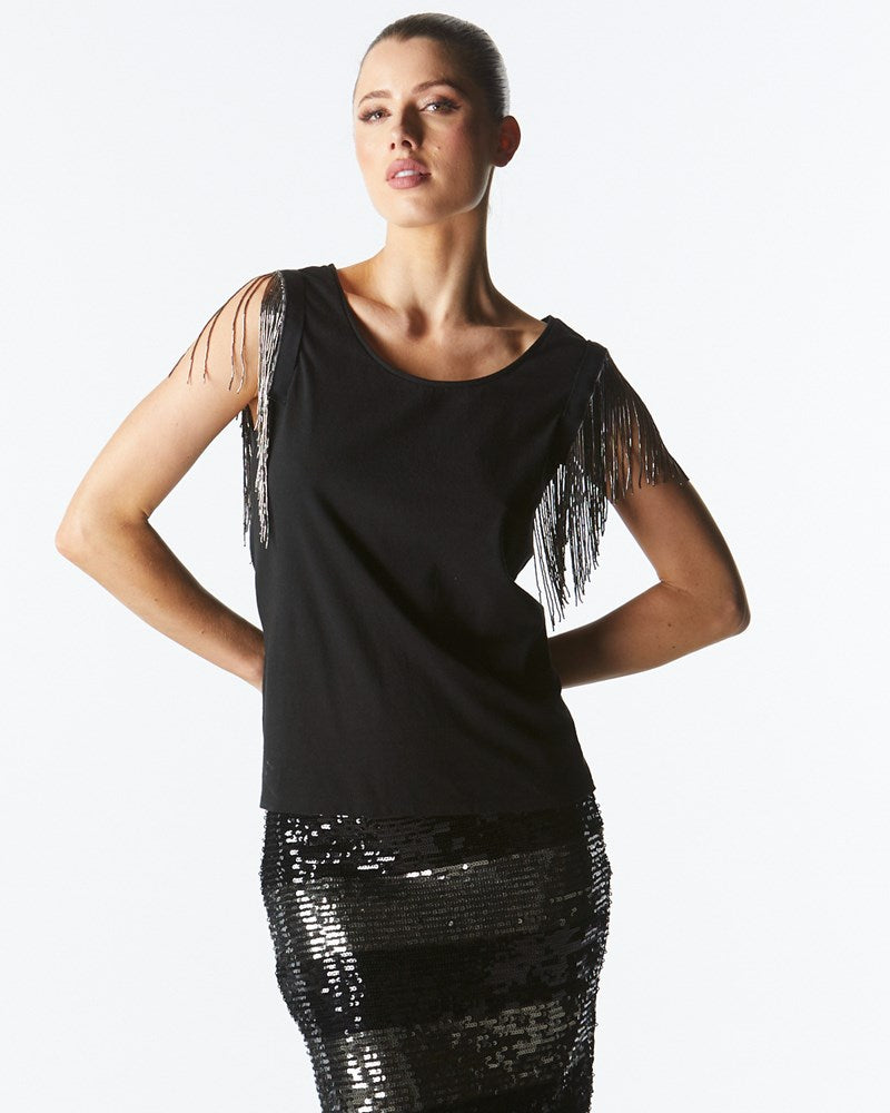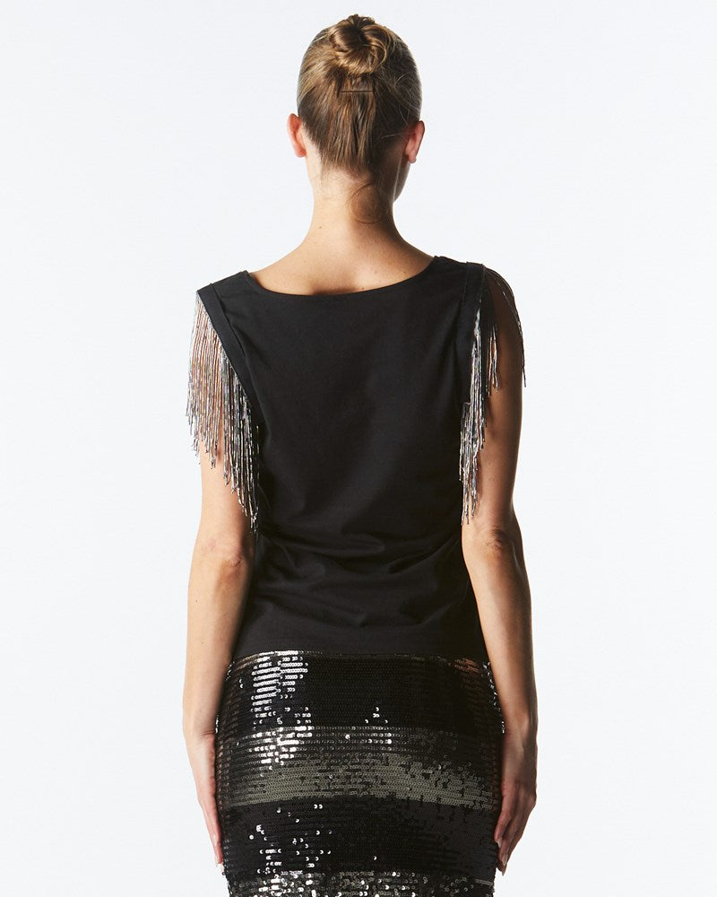 The Windflowers Top brings sophistication with its stretch fabrication and beaded tassels at the armhole. A scoop neckline and fitted body make this a comfortable yet polished option.
