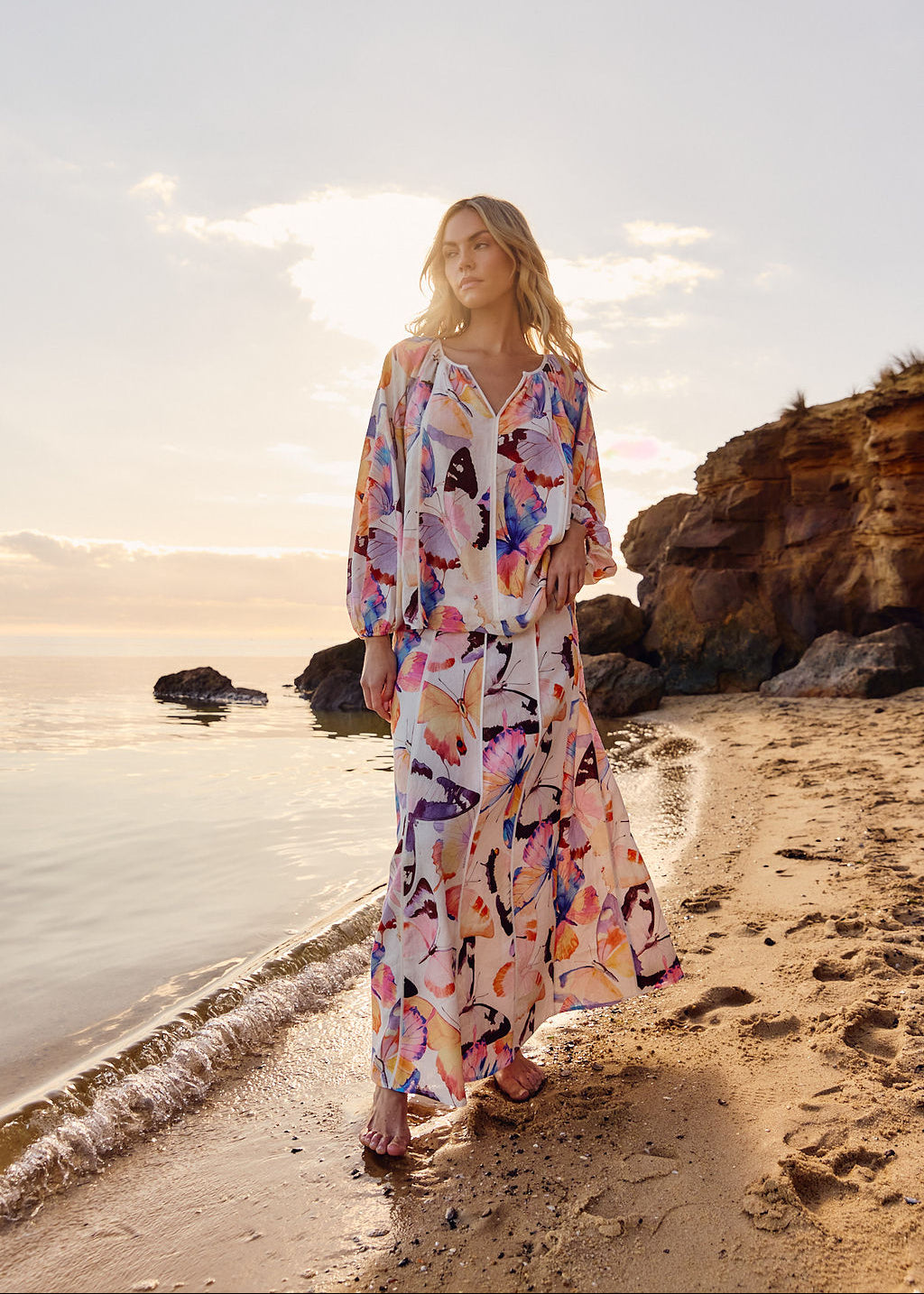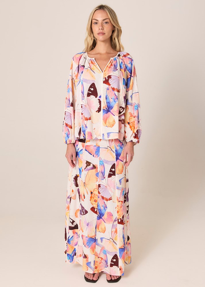 The Mariposa Print Blouse is an elevated piece in an exclusive butterfly print. A softly gathered neckline with a split detail creates a refined, elegant frame. Billowed sleeves with elastic cuffs add gentle volume while staying effortless. Crafted in a light, airy fabrication for a sophisticated finish.
