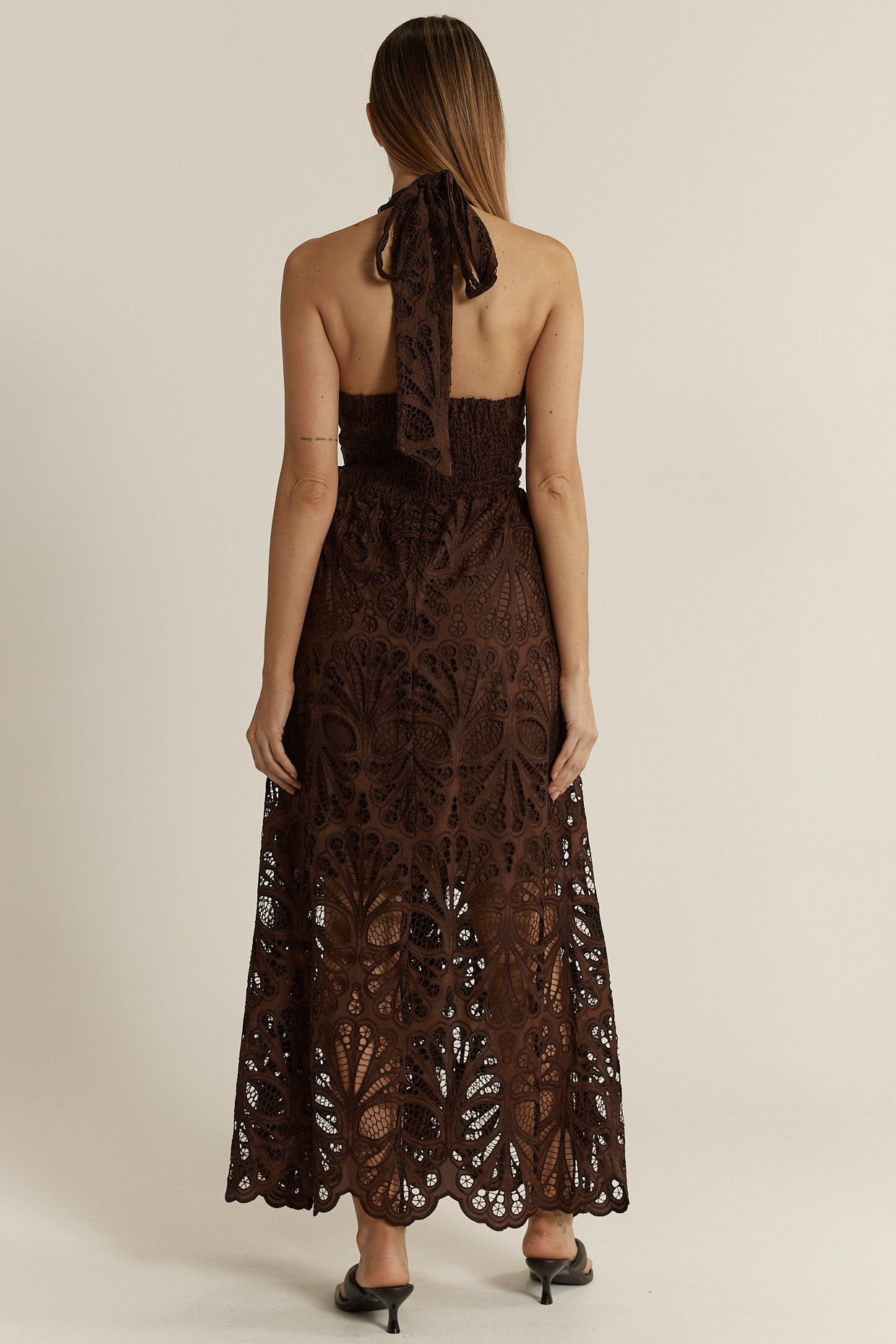 The Elara Broderie Dress is the essence of refined femininity. Featuring a halter neckline, open back and shirred detailing for comfort, it’s beautifully crafted in intricate broderie. A statement piece for elevated occasions, timeless in its simplicity.