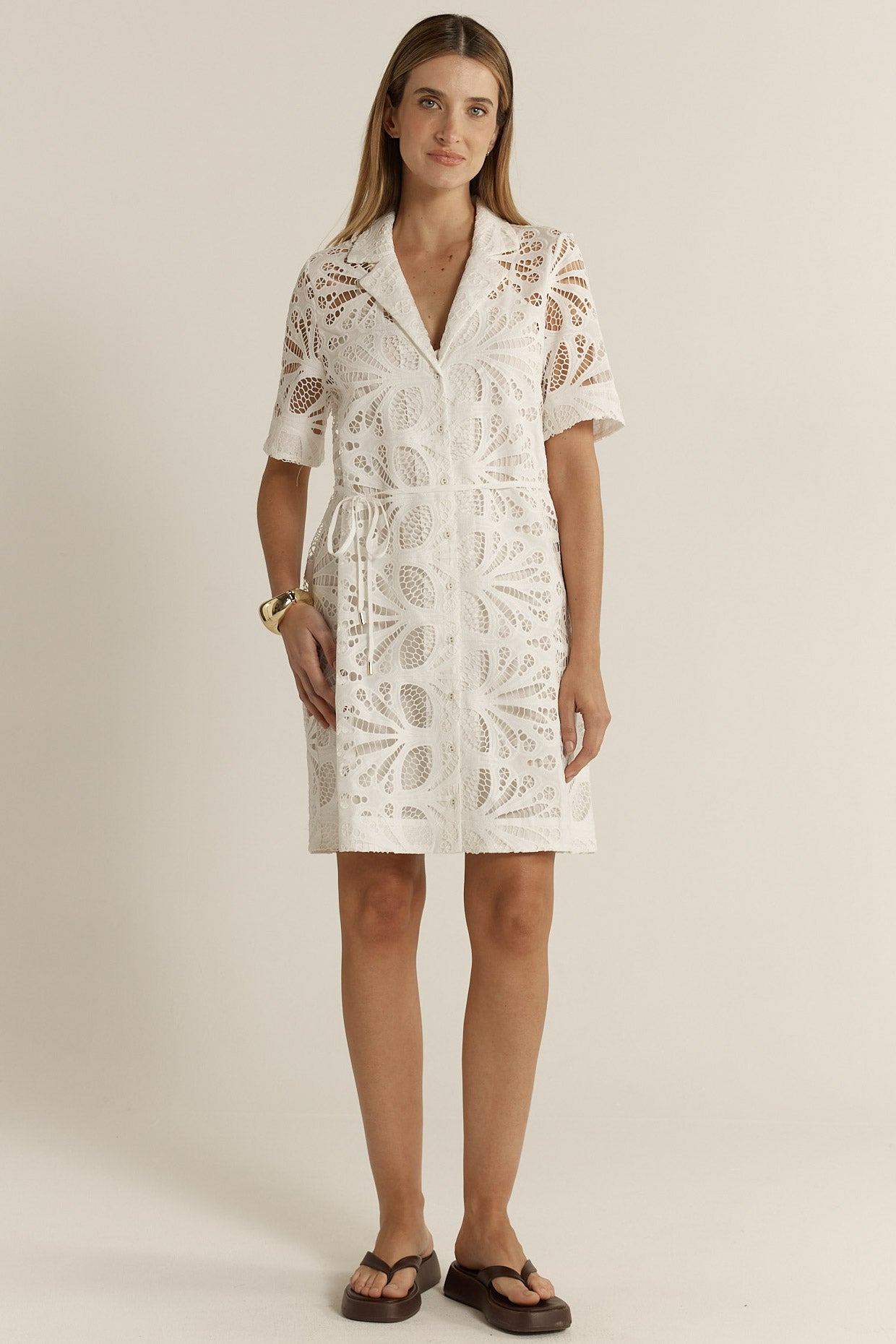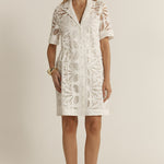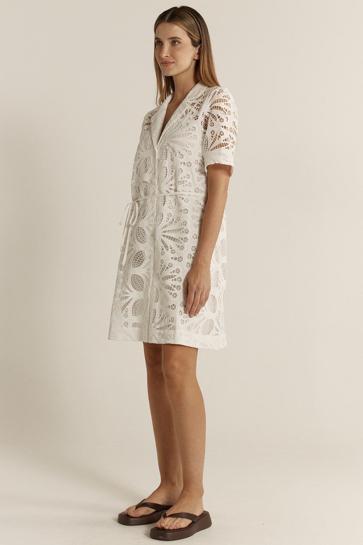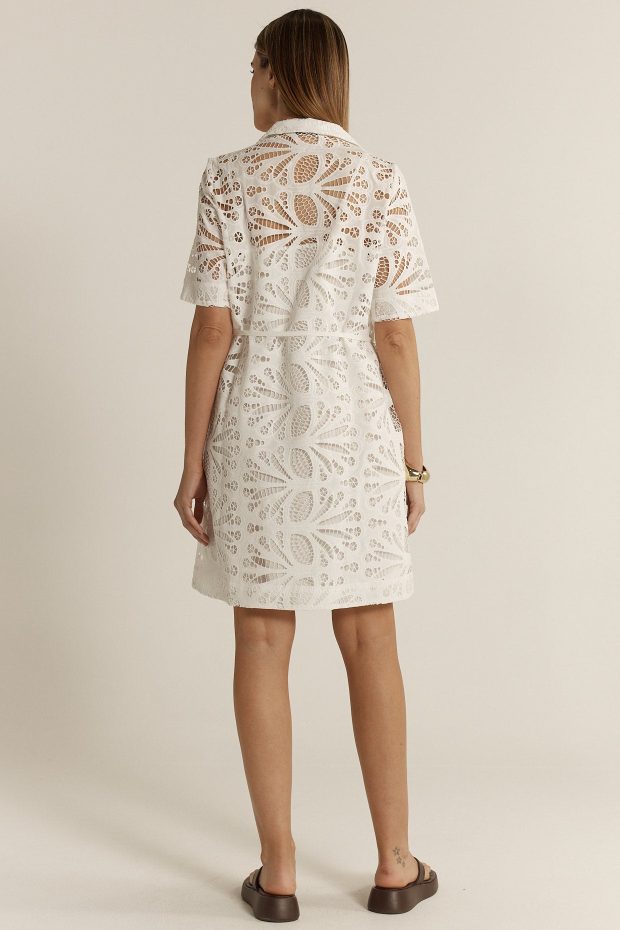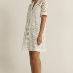 The Elara Broderie Shirt Dress combines refined femininity with ease. Designed with an adjustable tie and gold detailing, it includes a slip dress for seamless wear. The mini length and intricate broderie make it an elevated statement for any occasion.