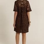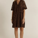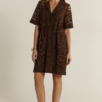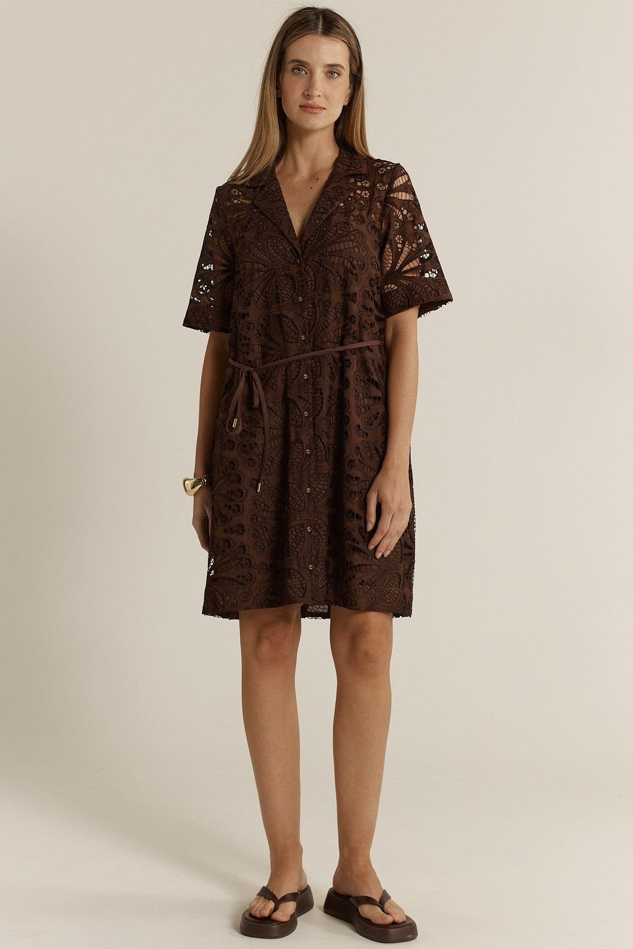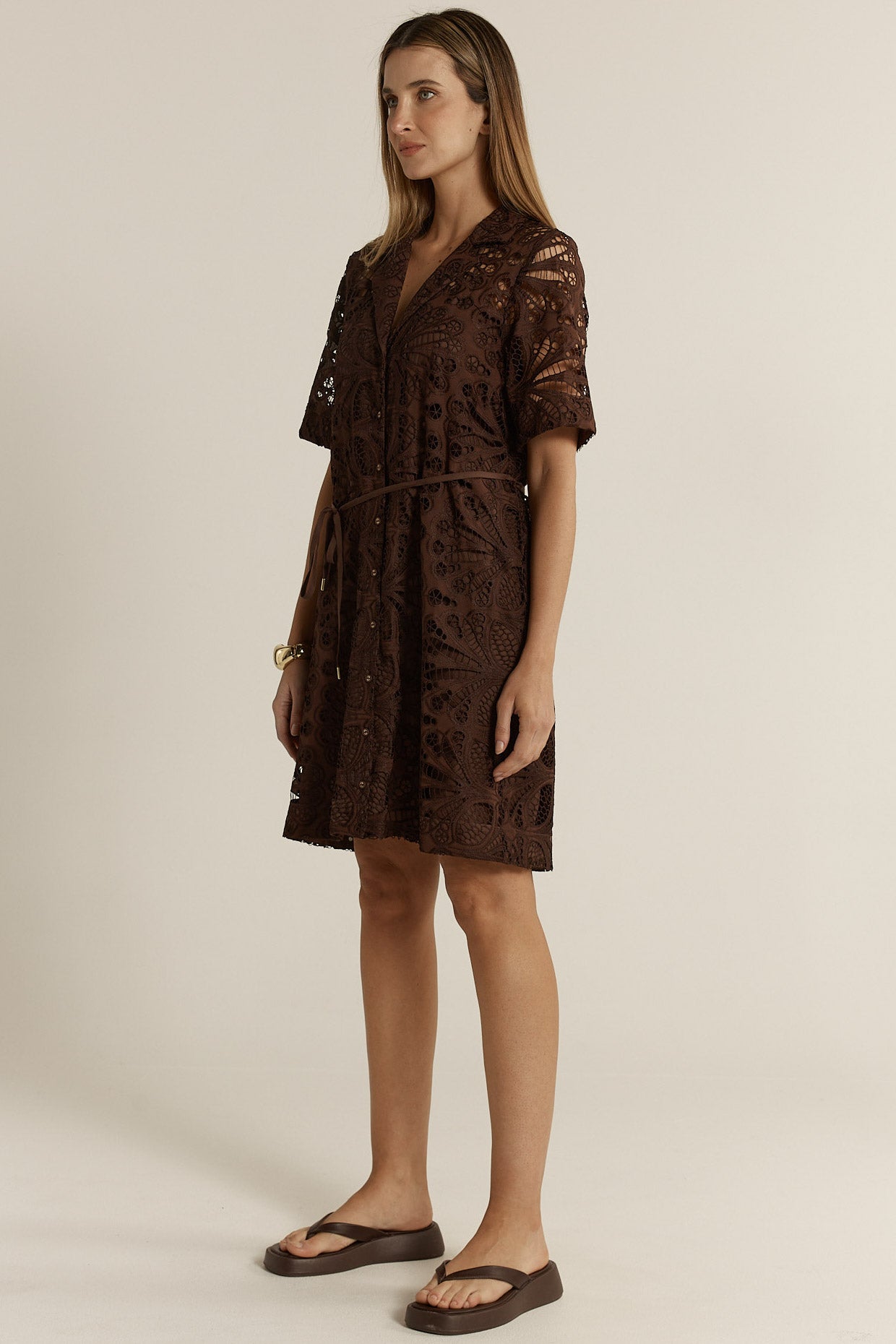 The Elara Broderie Shirt Dress combines refined femininity with ease. Designed with an adjustable tie and gold detailing, it includes a slip dress for seamless wear. The mini length and intricate broderie make it an elevated statement for any occasion.