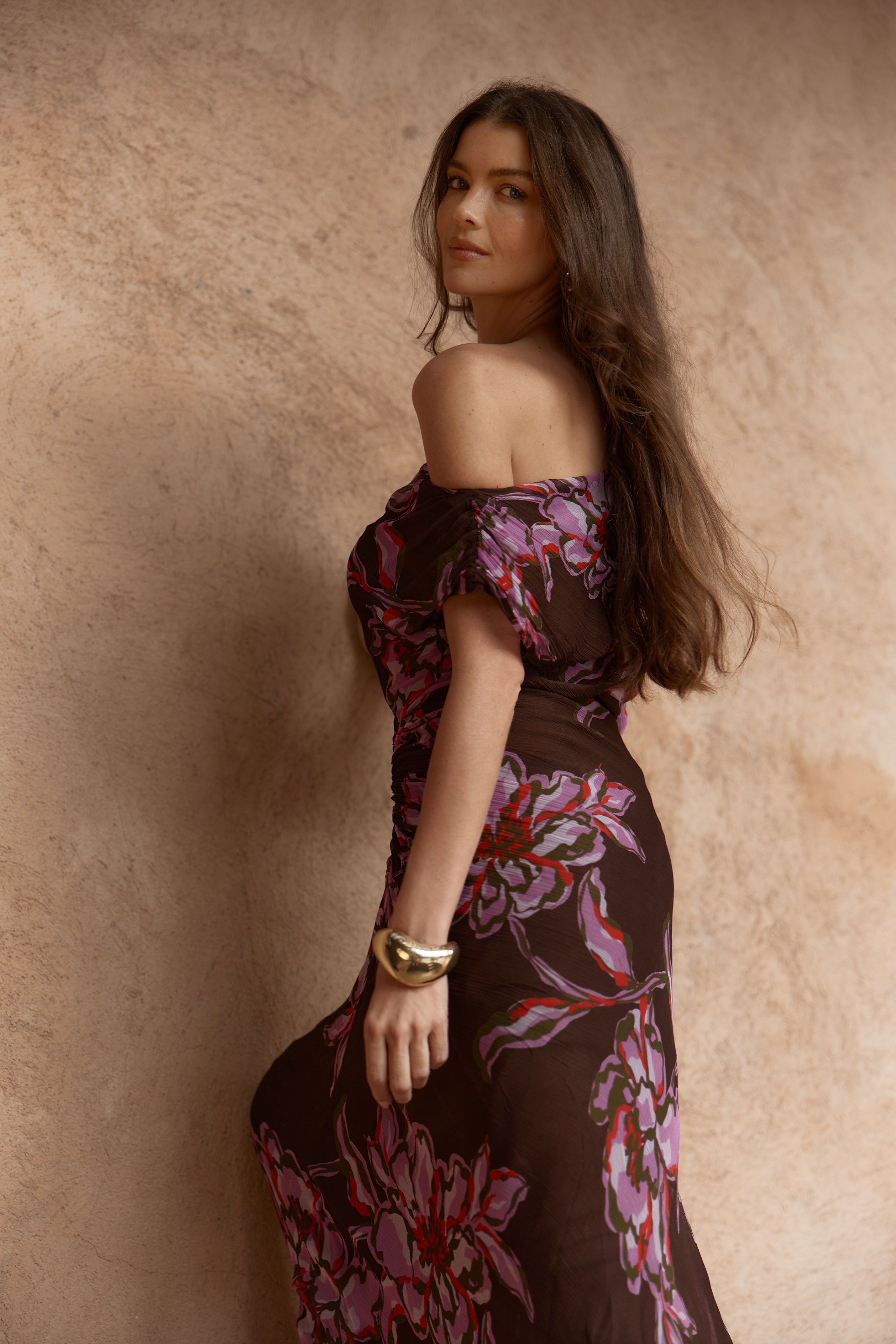 The Margo One Shoulder Dress is an elevated study in asymmetry. Featuring an exclusive floral print, it drapes effortlessly through a full-length silhouette. Subtle gathering at the waist creates refined shaping. A sophisticated trans-seasonal piece designed for modern occasion wear.