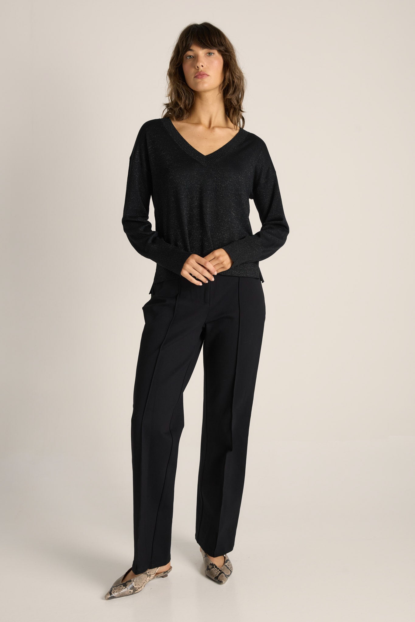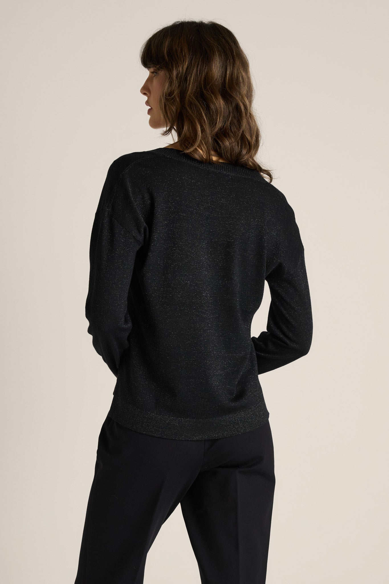 The Oriane Sparkle V-Neck Knit delivers subtle glamour with refined ease. Crafted in a fine-gauge knit, it features a polished V-neckline and extended ribbed cuffs. A soft shimmer runs throughout, enhancing its elevated finish. A transeasonal essential with sophisticated appeal.