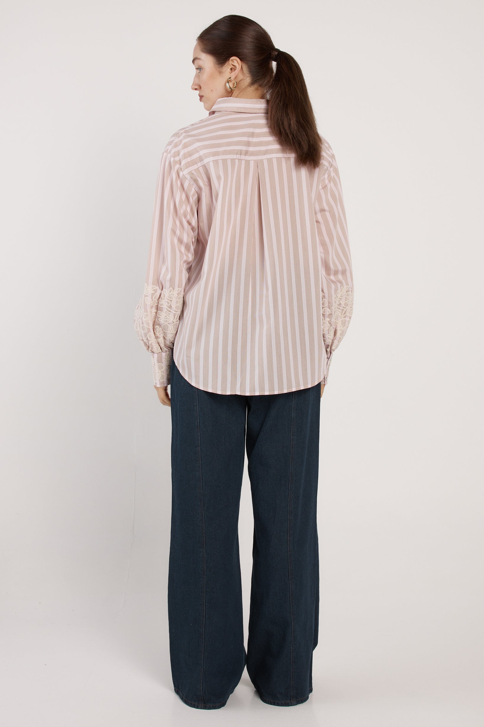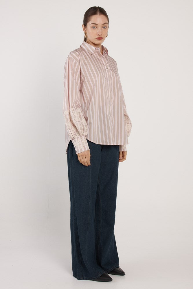 The Paloma Striped Embroidered Shirt is a classic shirt reworked with refined detail. Crisp stripes are balanced by lace-detailed cuffs for an elevated finish. A button-through front and classic collar keep it polished and sophisticated. An effortless piece that reads elegant from desk to dinner.