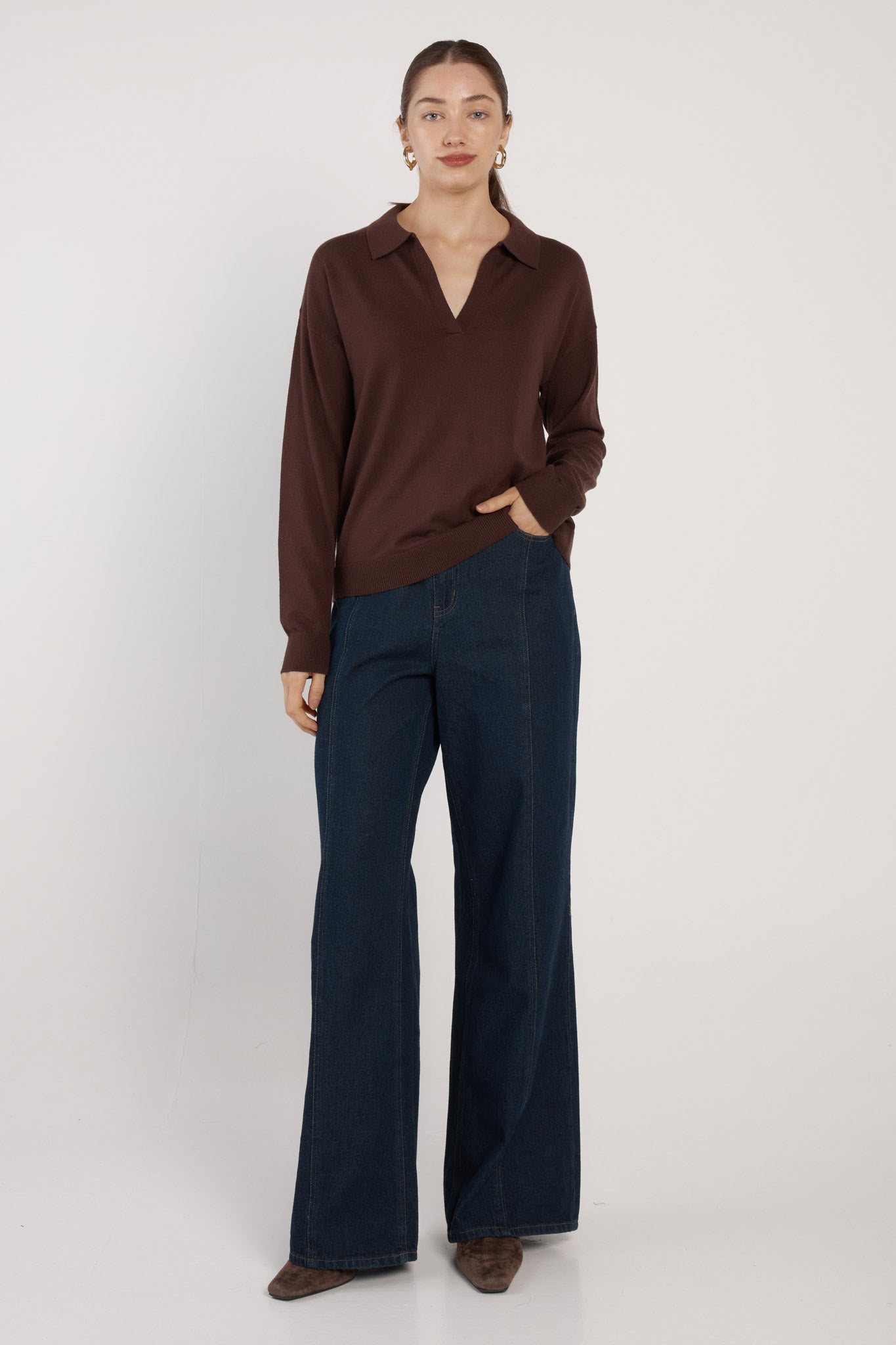 The Solenne Polo Knit refines everyday knitwear with understated polish. Its open collar and subtle V-front neckline create a clean, modern silhouette. Ribbed trims enhance its structured finish. A sophisticated trans-seasonal essential designed for effortless styling.
